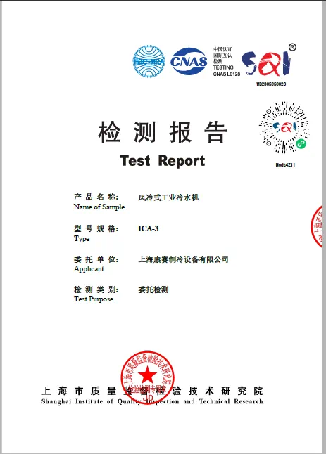 ±0.1℃高精度冷水機是經過上海市質量監督檢驗技術研究院專業檢測認定的,這就是對康賽制冷強大研發實力的最好證明。